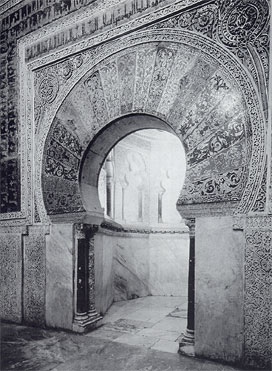 Left: The prayer niche at the "Great Mosque" of Cordoba. The decoration was done in 949 AD by Byzantine craftsmen sent to Spain by Emperor Constantine 7 Porphyrogenitus, who also sent, as a gift, a Greek manuscript to the Spanish Khalif at the same time.